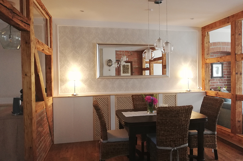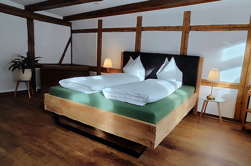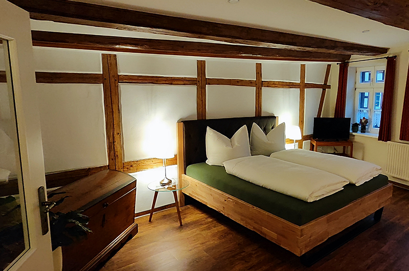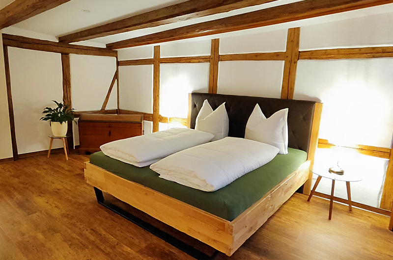 Beim Umbau 2021-2023 wurden das Fachwerk und die Lehmwände wieder sichtbar gemacht.