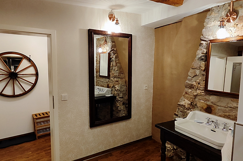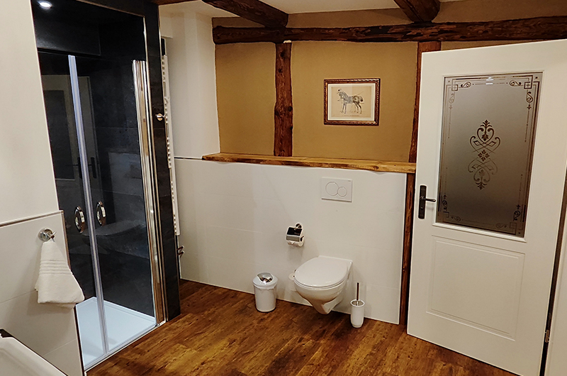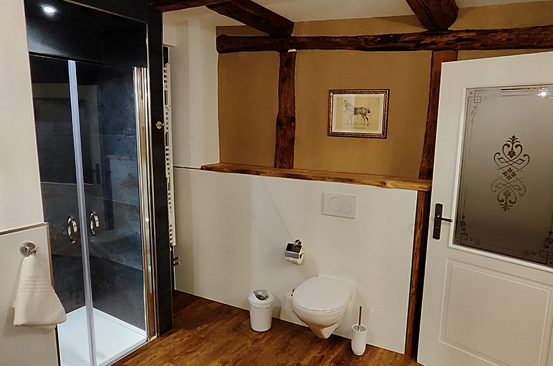 Unser Kutscherzimmer lässt Sie in die Vergangenheit zurückreisen. Lehm- und steinverputzte Wände mit sichtbaren Balken im Flur, Bad und Schlaf-Wohnraum lassen die Ursprünge des Hauses wieder aufleben.