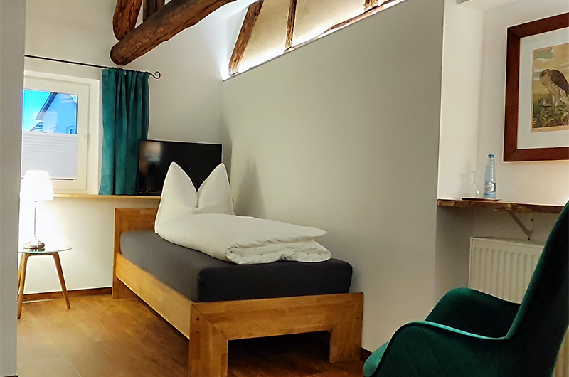 Das Zimmer ist mit einem gemütlichen Bett und Sessel ausgestattet. Zusätzlich ist noch ein Sofa vorhanden, welches auch als Aufbettungsmöglichkeit für eine weitere Person genutzt werden kann.