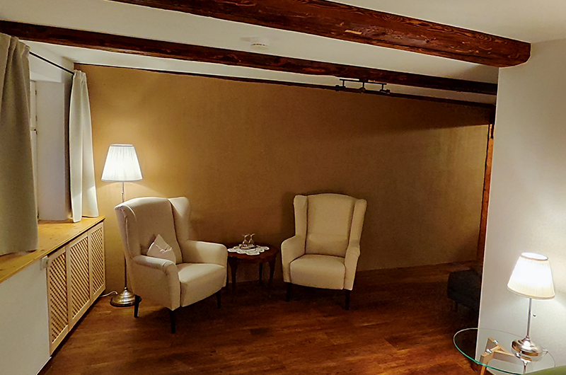 Ein Sofa dient als Aufbettungsmöglichkeit für eine weitere Person und zwei gemütliche Sessel mit Tisch laden zum Verweilen ein.