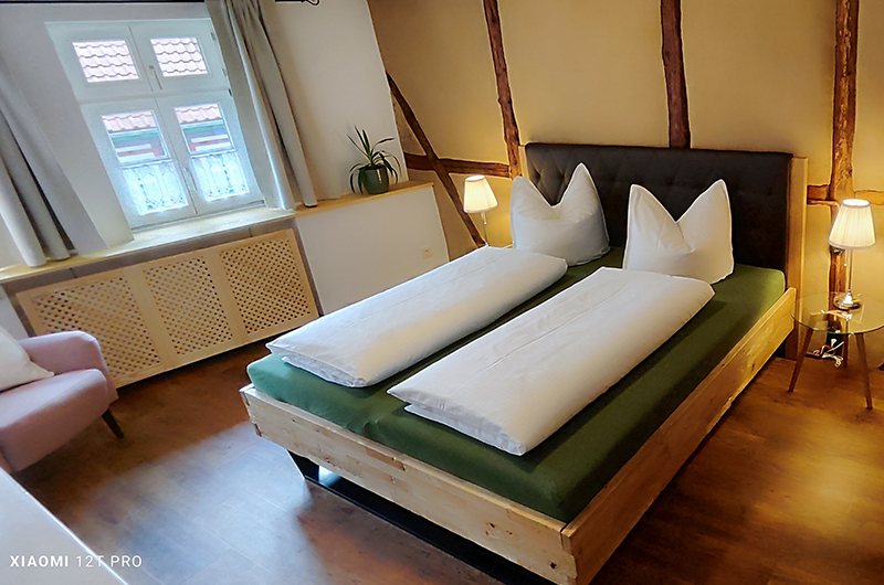 Das Zimmer zeigt in Richtung Geschäftsstraße. Das große Doppelbett und zwei bequeme Sessel laden zum Verweilen ein.